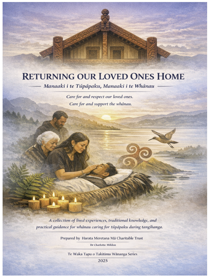 Returning Our Loved Ones Home is a timely and important resource by Dr Charlotte Mildon, developed through recent research completed by the Harata Meretana Mā Charitable Trust. Grounded in the lived experiences, wisdom, and reflections of whānau, kuia, and tauira who contributed through the Te Waka Tapu o Takitimu Wānanga Series, this publication offers practical and culturally grounded guidance for caring for loved ones during tangihanga.