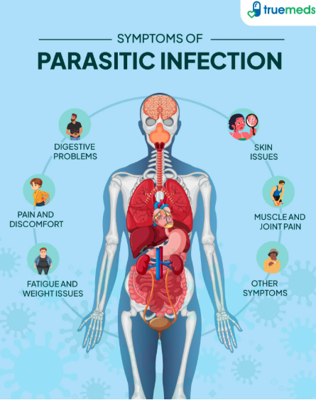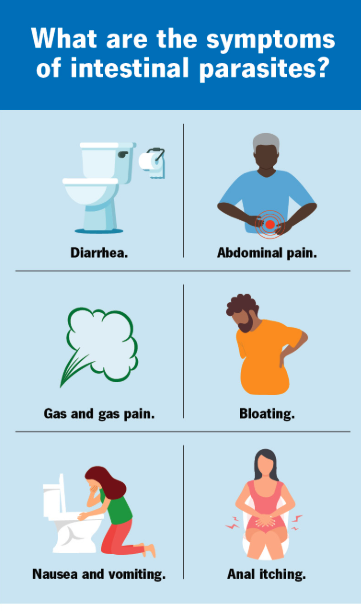Symptoms of parasites in the body include digestive issues like diarrhea, abdominal pain, bloating, and nausea, as well as other signs such as fatigue, weight loss, fever, muscle aches, and skin rashes. The specific symptoms can vary depending on the type of parasite and the location of the infection in the body.