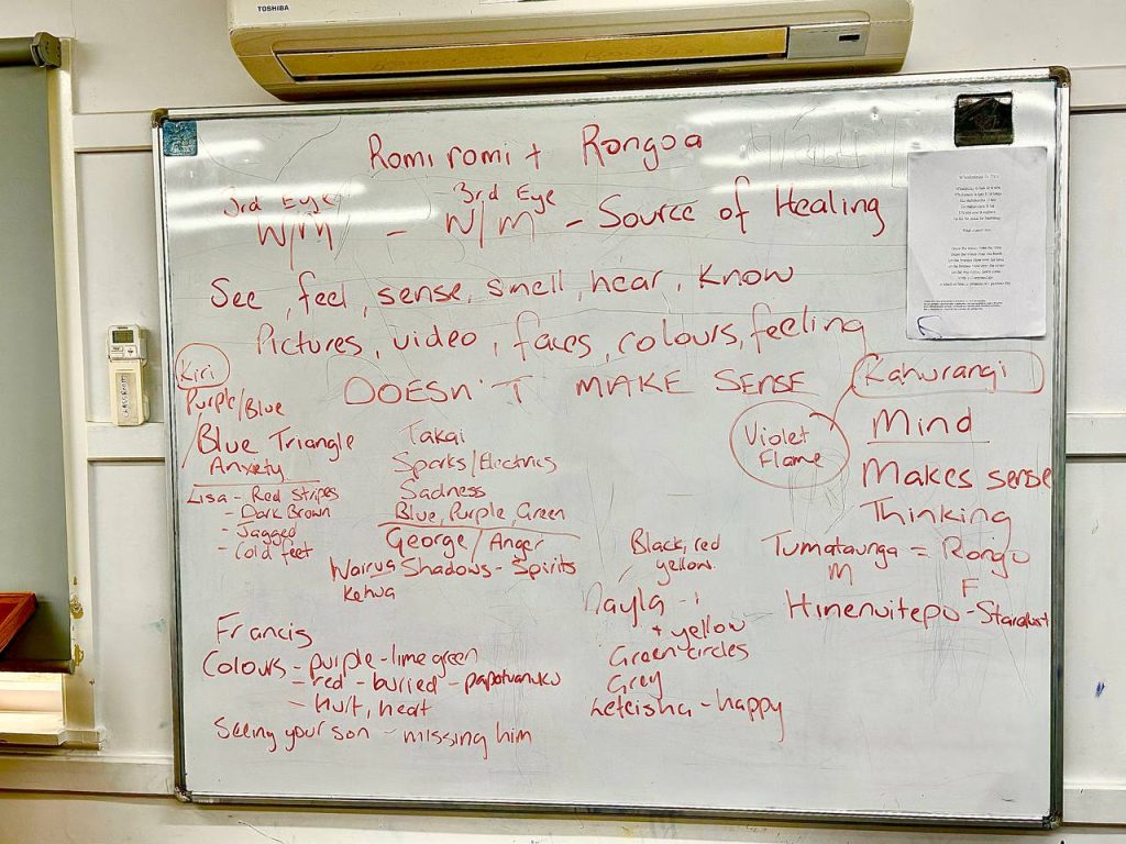 During this session, accessing the whatumanawa, there were many who had experienced a purple light, otherwise known in traditional Māori healing as the Kahukura – the violet flame of healing.
